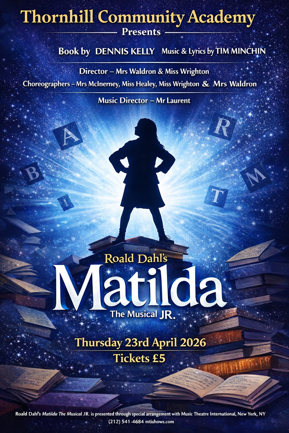 Roald Dahl’s Matilda The Musical JR. is presented through special arrangement with Music Theatre International (MTI). All authorised performance materials are also supplied by MTI.